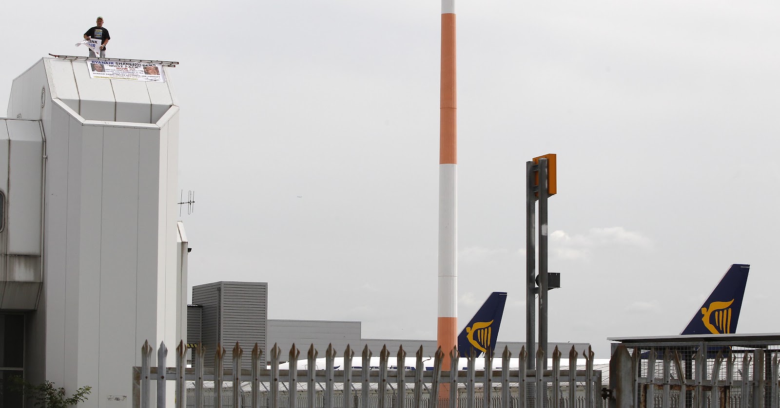 Below we reproduce some photographs of the rooftop protest held by John Foley at Liverpool John Lennon Airport. To avoid embarassment to the airport and Ryanair, the police placed a news blackout on the protest, meaning the local media were unable to report the story. As a result, Solidarity Federation was the only organisation publicising the action against Ryanair's exploitation of young cabin crew recruits.